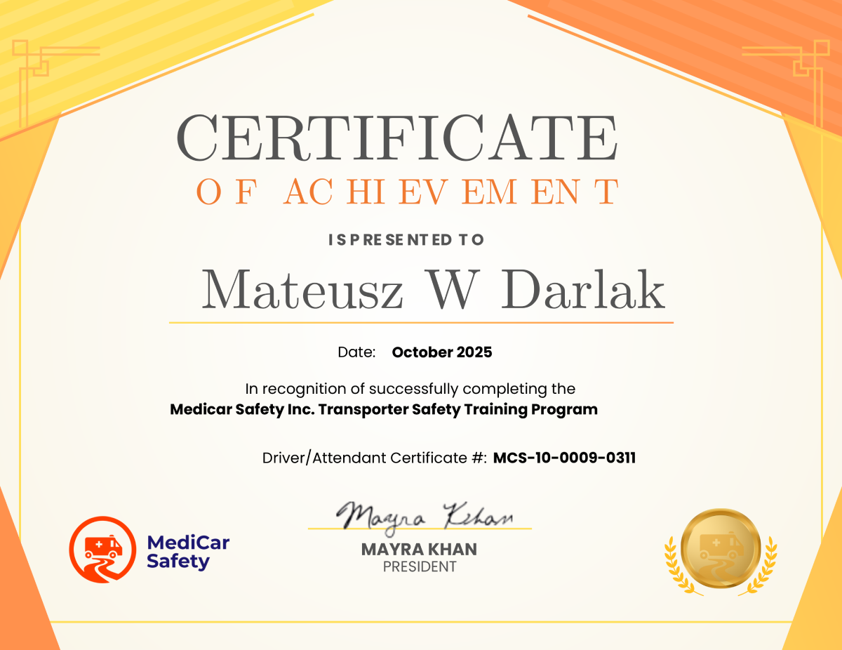 Maintaining current certification in Cardiopulmonary Resuscitation (CPR) and Basic First Aid, Mateusz meets and exceeds healthcare transportation safety expectations, providing peace of mind for passengers, families, and healthcare providers throughout the Chicago metropolitan area.