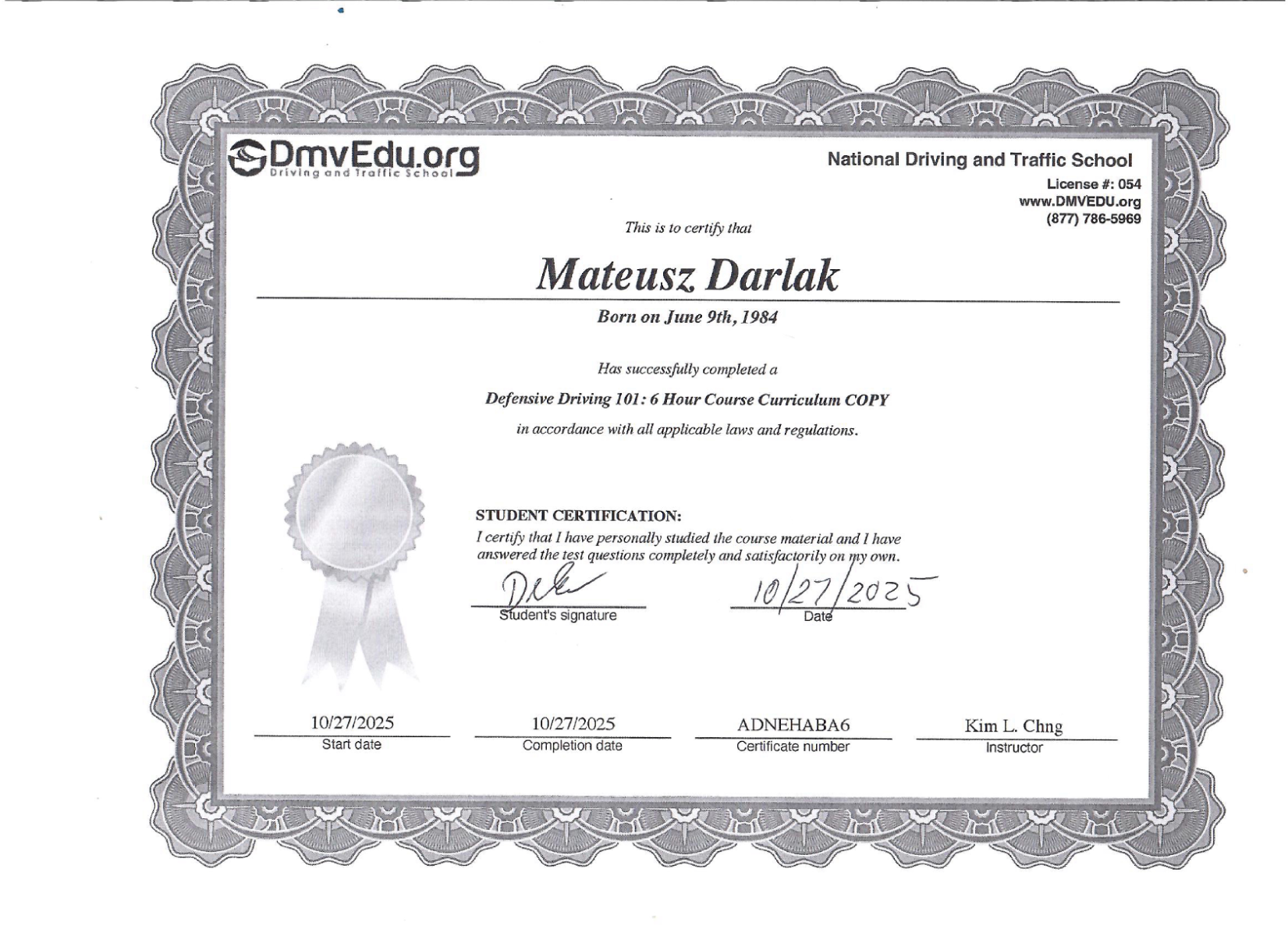 Mateusz is trained and certified as an Illinois Caregiver, qualified to assist passengers with limited mobility, seniors, and individuals with disabilities in accordance with Illinois Department of Human Services (IDHS) and Healthcare and Family Services (HFS) guidelines. This specialized training ensures every passenger receives appropriate, compassionate care during transportation throughout Chicago and the suburbs.